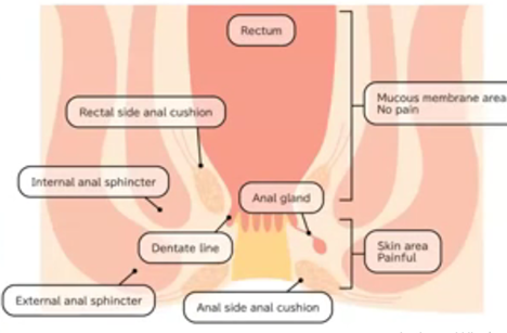 Ili kusaidia kueleza sehemu vilipo viungo vya sehemu ya haja kubwa, mfano wa saa hutumika, na mgonjwa akiwa kwenye mkao wa lithotomy (akiwa amelalia mgongo na miguu kunyanyuliwa juu). Mshale wa 12 ni sehemu ya viungo vya uzazi na mshale wa 6 ni kuelekea upande wa nyuma (mgongoni). Anal cushions zitakuwa kwenye maeneo ya 3, 7 na 11.