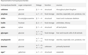 Homopolysaccharides zinazoundwa na glucose zina glycogen na starch -kabohaidreti za hifadhi za wanyama na mimea -pamoja na cellulose.